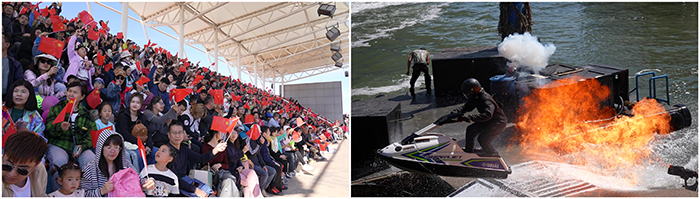 節日期間,王牌演出《航母風暴》《飛車特技》《極炫飛躍》《極限追逐》全天候輪番上演,7天共計演出57場,場場爆滿。文化商業街里航母吉祥物吉福、抱豹、妃妃快閃派對,小丑先生表演秀每天40余場不間斷與游客在街頭親密互動。主題活動區內,國慶主題手繪墻、創意打卡墻等活動吸引眾多親子游家庭參與,景區內處處洋溢著濃厚的節日歡樂氣氛。節日期間,游客們紛紛登航母、看軍艦,領略“航母編隊”的恢弘氣勢。此外,景區內數十種“海陸空”游藝項目,吸引諸多游客前來體驗。